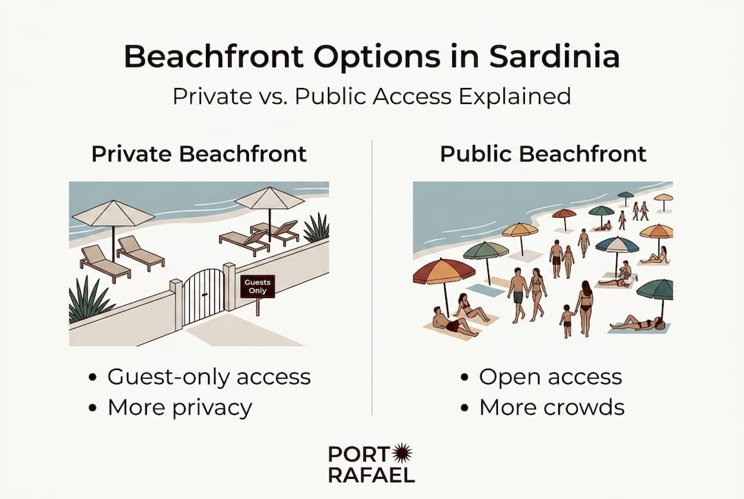 What is the difference between private and publicly accessed beachfront in Sardinian resorts?